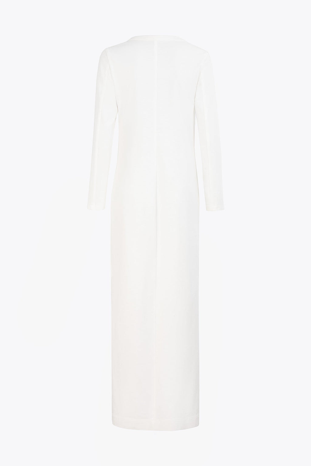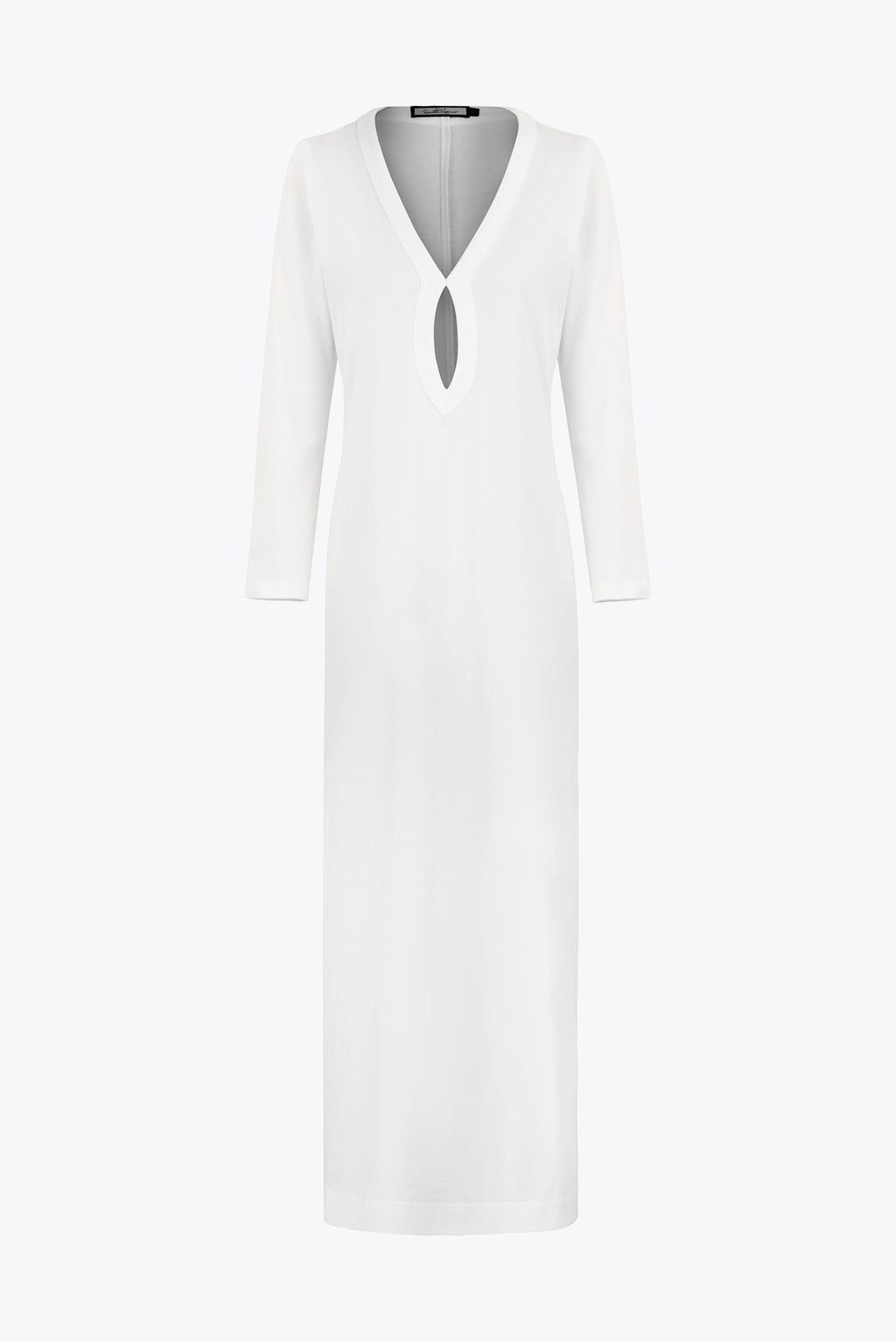 Style: long dress with a straight silhouette, long sleeves, a deep neckline, and a central opening.