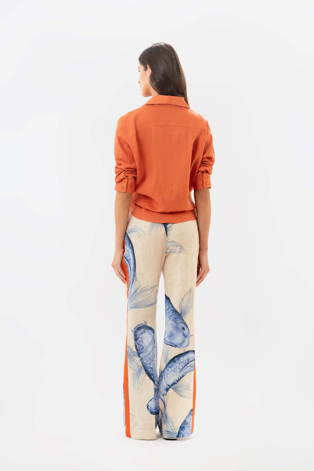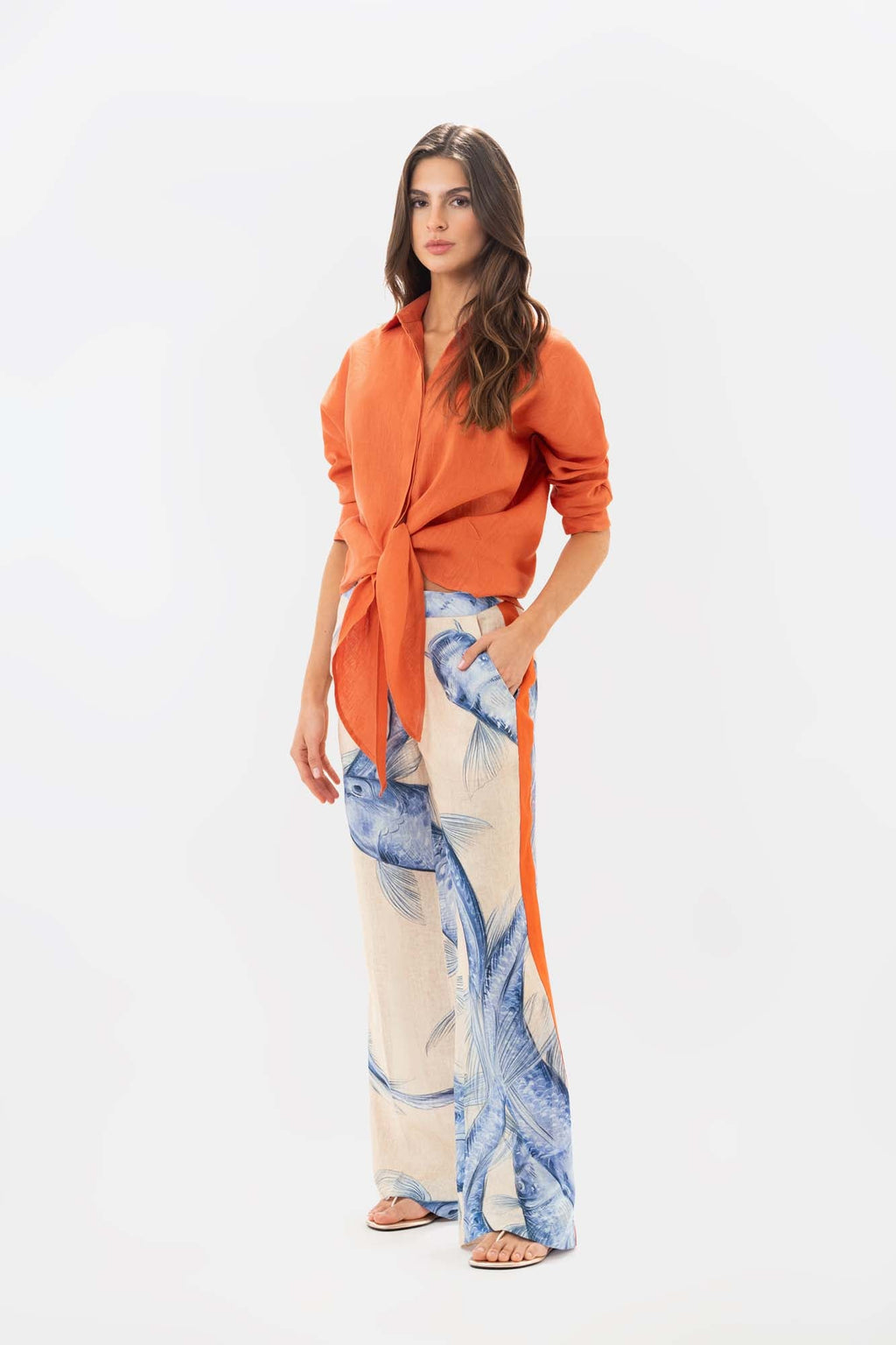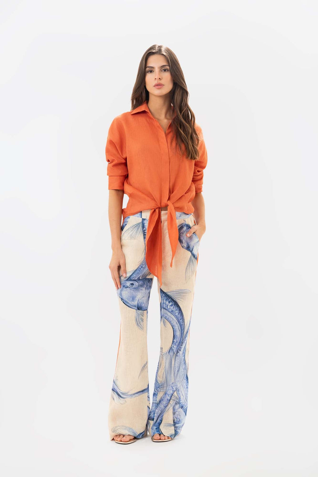 A linen shirt that brightens the look with natural ease. Its roomy silhouette, front tie detail, and Solar Orange tone create a fresh, feminine, and highly versatile piece to accompany you through sunny days, travel, or special moments. Within the collection, it brings a serene yet sophisticated pop of color that moves lightly and elevates any combination.