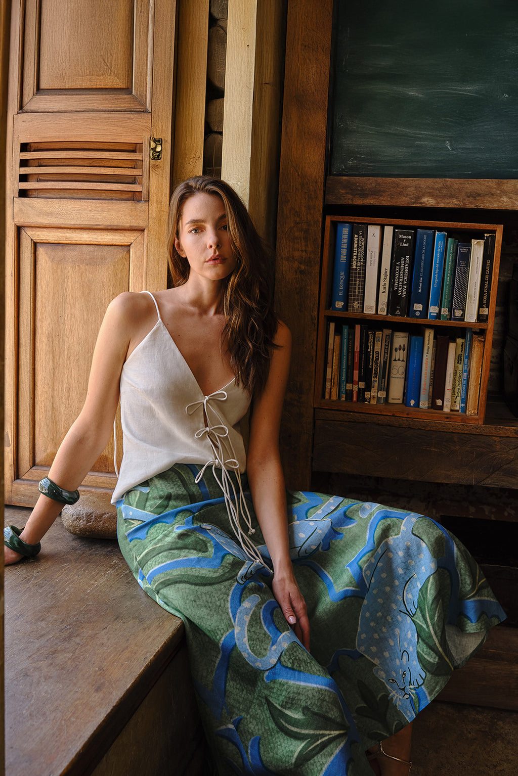 The Isla Ivory Blouse is an expression of refined simplicity and natural femininity. Crafted from 100% linen, its light and fresh texture softly drapes the body, offering a sense of freedom and elegance in perfect balance. Its design with thin straps and a deep neckline featuring delicate adjustable front ties evokes subtle and sophisticated sensuality, ideal for bright days or getaways where comfort meets style.