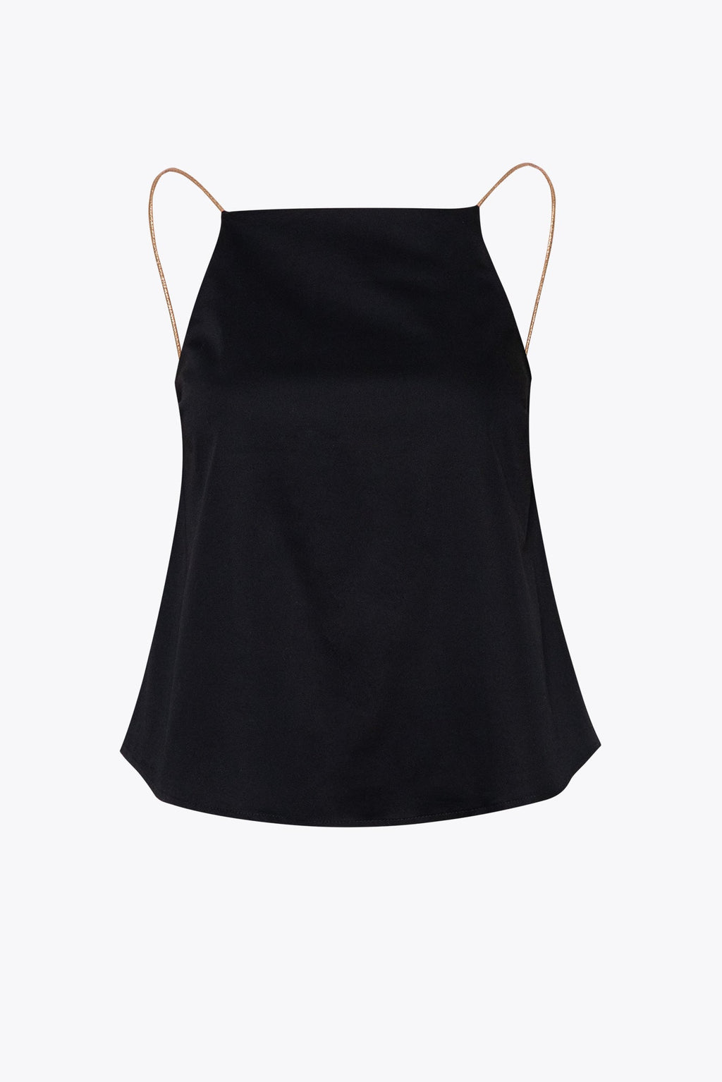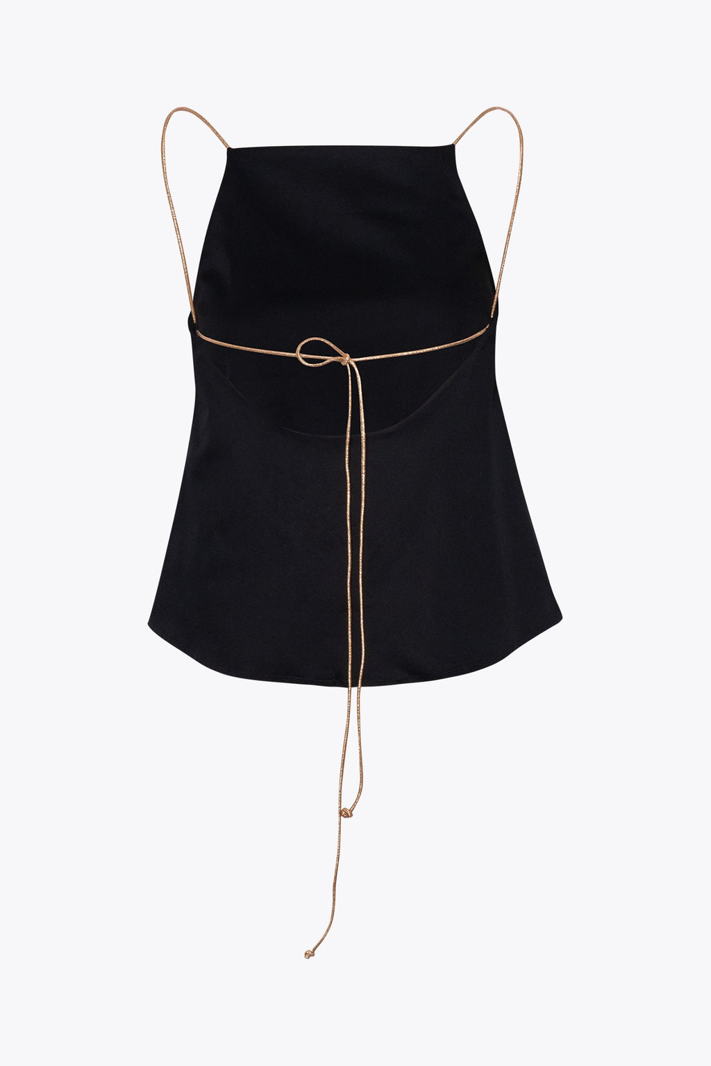 The Orlena Black Blouse is an essential, modern piece within the Nómada universe: lightweight, feminine, and designed to flow naturally with the rhythm of each day. Its minimalist design gains strength from the delicate gold elastic lurex straps — a subtle yet distinctive detail that illuminates the skin and elevates the silhouette with an elegant touch.