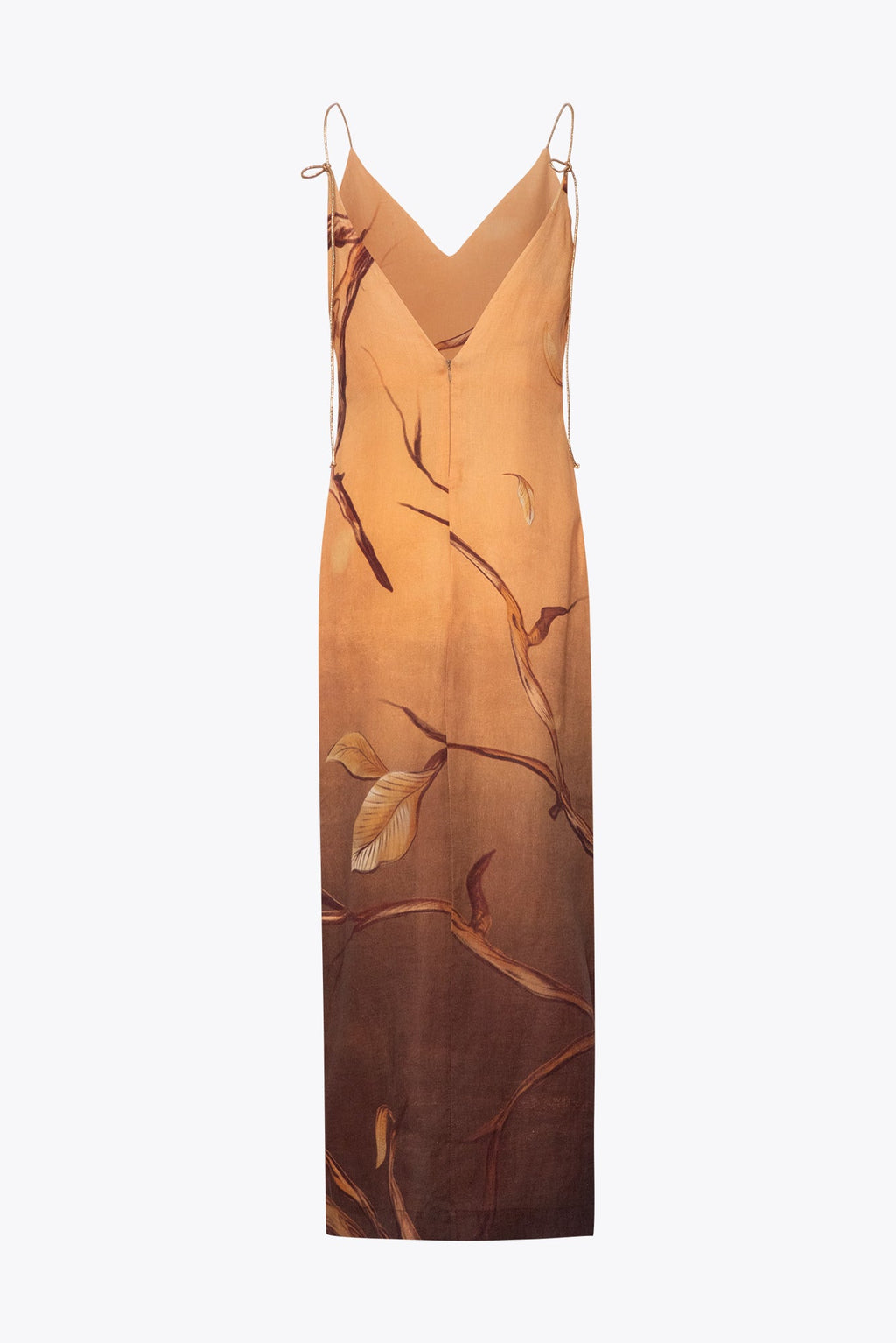 The Trama Brown Dress is an iconic piece that celebrates the connection between nature, strength, and contemporary femininity. Crafted from 100% linen, its light and fluid silhouette drapes naturally over the body, while its artistic print—a jaguar in earthy and golden tones—evokes the wild energy and free spirit that inspire the Indeleble collection. The delicate elastic and lurex straps at the back enhance its artisanal charm and add a subtle touch of shimmer, creating a contrast between the organic and the sophisticated.